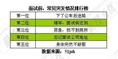 我们建议大家在面试前做好周全的准备,可就算是“万事俱备”,还会有“欠东风”的时候,在去往面试的旅途中,各种突发情况总会不请自来。根据横店人才网论坛的调查数据显示,迷路、堵车在各种突发情况中最为常见(见表)。