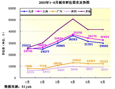 京沪两地在职场上向来龙争虎斗,力争成为全国良才心中的第一高地。今年1月北京的职场需求尚走在前,但转眼间便被上海赶超。从职位需求走势来看,各城市均遭受了SARS的影响,北京的下降幅度最为严重,深圳似乎是最快从SARS中走出的,6月惟有其拉出小阳线,另外广州的表现也较为平稳。