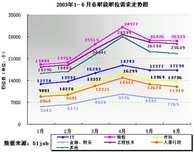 从各职能职位需求走势来看,销售类的职位需求在SARS打击下受到了相当大的影响,5月的下降幅度竟然达到了14%,使得排名第二的工程技术类得以无限接近销售类的有效职位数。眼看暑期促销的黄金时段即将来临,不知销售类会否恢复过来,从而拉动年中的职位需求量。销售类的一些低端职位尽管能救某些“隐性失业者”的急,但救急之选并非一个长远发展的规划的起点。尽管我们一再强调对于满怀热忱的“职场新人”来说,放低姿态、踏入职场是最先最必要的一步,但决不可“病急乱投医”,为了在大城市立足轻易地改变自己的专长和喜好并不是好的起点,打入自己所擅长或是喜好的行业,开始时辛苦一点心态放低一些,才可能有长足的进步和发展。要早一些做出自己的规划,不妨务实地思考以下问题:我到底背负了什么责任?我是家庭生计来源的主要负担者吗?我希望从事哪个行业?我希望在怎样的团队工作?我对自己的3-5年期望是什么?每个人的要求与情况都不同,定期检视自己的这份选择表,审慎思考要把哪些要素列入这张表的“优先座位”;而一旦排定后,就不要瞻前顾后一再徘徊,否则就会沦于不断骑马找马之中,陷入高不成低不就的怪圈。此外,如果你的专业本身就不够精不够深,那么学得广一些相对出路也可能广一些,比如学习广告设计专业的,可以结合营销背景,为自己打开通路,从而更好地与客户打交道,甚至转向公关方向;学习网页设计的不妨再加强3D设计的能力,甚至学习一些基本的数据库知识、能写一点小程序,以便与开发部的同事更好的沟通。30岁之前可以去试探自己适合的工作,但随着年纪渐长,必须趋于稳定,加强自己的职业含金量,为自己的眼光负责。