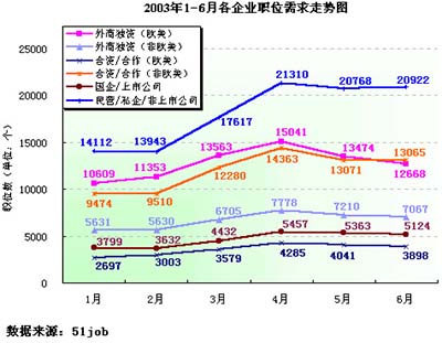 从各企业职位需求来看,外商独资(欧美企业)似一朵尊贵娇弱的花——最受求职者青睐,但也最易受到外界动向的影响。9·11曾让外商独资(欧美企业)处于很长一段时间的低潮中,而如今的SARS又让外商独资(欧美企业)失血最多,4月过后其职位需求量直线下降,合资/合作(非欧美)企业虽时有抢眼表现,不过还是让SARS狠狠撞了一下腰。无忧职场中,民营/私企/非上市公司对于人才的需求量始终保持着较为旺盛稳定的增长势头,即便是在SARS打压下,也只是小小回落,并且从5月的下半月便反弹上升,走出SARS阴影。深圳市人事局局长更是表示,民营企业市深圳经济发展的重要力量,到2005年,民营企业在深圳未来的用人数量中将要占到六成比例,人事局也将在毕业生分配、异地人才调入等方面大力扶持民营企业。如果所有的民企/私企在人力资源的引入和管理上再做得科学一点,再做得有序一些,不是等到业务拓展或者滑坡时心急火燎地寻找“救火队长”,而是长期稳定地储备人才的话,那么才会真正让求职者安心驻扎,放手拼搏。