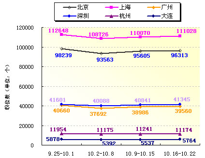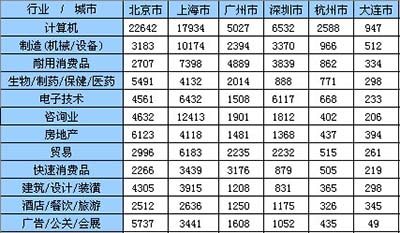 从无忧指数各行业有效职位数的排行情况来看,IT业仍是各城市最热门的行业,制造业排在第二位,耐用消费品行业稳居前三强,生物/制药/保健/医药行业的人才需求量今年以来一直很旺盛,紧随三甲之后,电子技术业退居到第五位(见图2)。从各城市细分情况来看,10月职场中,北京对于房地产行业和广告/公关/会展业人才的需求居于全国前列;上海在制造业和咨询业的人才需求上远远高于国内其他城市;深圳在电子技术人才的需求上紧随上海之后,吞吐量很大,对于生物/制药/保健/医药行业的人才需求也进一步稳固上升;广州的热门行业结构并未产生太大变化,仍以耐用消费品、快速消费品业和贸易业为主;杭州在耐用消费品业、生物/制药/保健/医药行业的人才需求上保持了一贯的“好胃口”,对于贸易业和快速消费品行业的人才需求也进一步提升;大连本月在房地产和酒店/餐饮/旅游业上的需求有良好表现。