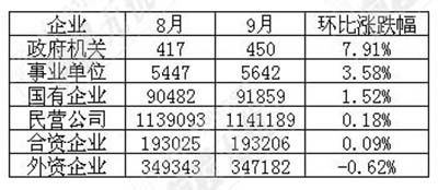从招聘的各企业性质来看,外资企业在9月的招聘数也没有随着招聘旺季的到来而旺起来,反而职位数较上月下降了0.62%,与此形成鲜明对比的是,涨幅前三的企业都是具有国家背景的企业,分别是政府机关、事业单位、国企,涨幅分别为7.91%、3.59%、1.52%。民营企业的网上发布职位数为1 141 189个,虽然依然在各企业中保持领先,但较上月仅上涨0.18%,创今年下半年以来的涨幅新低(见表1)。伴随着欧洲债务危机、华尔街裁员等外界消极因素影响,对此敏感的外资企业、合资企业等较易受被波及,因此在这个传统的招聘大潮时节采取了谨慎姿态。随着外资企业、合资企业的走低,在即将来到的校园招聘大潮中,国有企业、民营企业等将成为应届生招聘的热点。