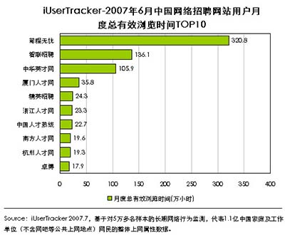 截止2007年8月1日17点,横店人才网已拥有注册用户超过2000万人,注册简历1350万,每天提供有效空缺职位80万个以上,日均浏览网面量高达3500万人次。另据iResearch艾瑞市场咨询最新推出的网民连续用户行为研究系统iUserTracker的最新数据显示,2007年6月中国各大网络招聘类网络媒体的用户有效浏览时间对比分析,横店人才网最高,月度总有效浏览时间达到320.8万小时,是第二名的2.36倍,地方性招聘门户用户有效浏览时间较短都在50万小时以下。