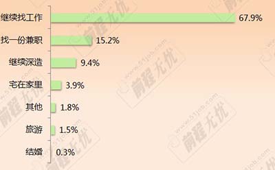 据横店人才网(www.328job.com)最新调查显示,67.9%的人会不言放弃,继续找工作,这一做法也得到了大多数人的认同。此外,也有一部分人表示会先找一份兼职干着,这部分人占总投票人数的15.2%。还有少部分人选择了继续深造(9.4%)、“宅”在家里(3.9%)、其他(1.8%)、旅游(1.5%)、结婚(0.3%)。(如图)
